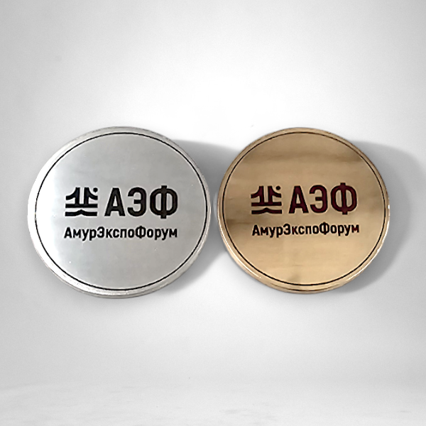Латунь, полировка, УФ-печать, диаметр 80 мм.